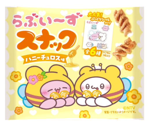 本商品に付属するぷっくりシールは「すもっぴ」や「ぴょんちー」を中心にデザインされた全6種類(うち1枚付属)。お菓子は「らぶいーず」の可愛らしい世界観に合わせ、ハニーチュロスをイメージして開発したオリジナル商品です。